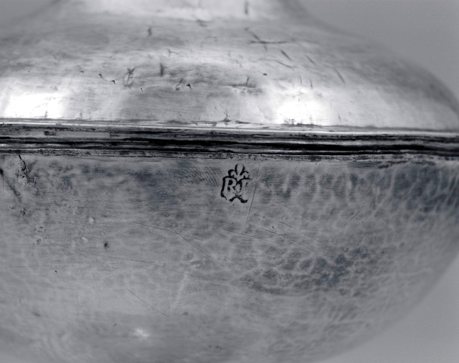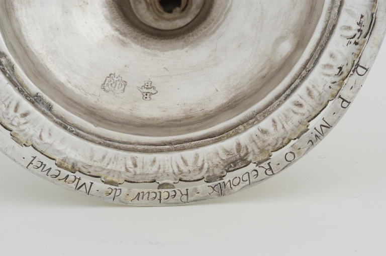 Poinçons (sous le pied et sur la coupe) : initiales R et D séparées par une hermine, un point sous chaque lettre, une fleur de lys au dessus, maître Richard Drouais ; communauté de Rennes, vers 1638 : hermine passante surmontée de la lettre R, lettre E entre les pattes. Inscription (gravée sous la bâte du pied) : D (onné) P (ar) Mre O. REBOULX. RECTEUR DE MERENEL.