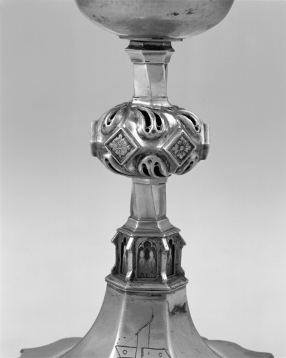 Ce calice est l´exemple même d´une oeuvre composite dont les remaniements ne nuisent pas à la qualité de l´ensemble. Le pied, sans ressaut, à découpe en accolade, la tige torse dont la base est ornée d´arcatures, le noeud à boutons carrés, parfaitement gothiques mais anonymes, datent incontestablement du XVe siècle. Les fenestrages tournants et repercés, la gravure incisive des boutons, correspondent à une réalisation de qualité, au-dessus des pièces ordinaires de l´époque. La coupe, par contre, plus haute que sur les modèles de cette époque et surtout insuffisamment évasée, est une réfection du XVIIe siècle. Elle porte avec le poinçon de communauté de Rennes et la lettre-date, A entre les pattes pour l´année 1630, le poinçon de l´orfèvre rennais Richard Drouais. Les émaux qui remplissent le fond des arcatures à la base de la tige, opaques et non translucides comme il se devrait pour une fabrication d´époque gothique, correspondent à une réfection du XIXe siècle. Une patène du XVIe siècle a été associée à ce calice à une date indéterminée, avant son entrée dans les collections du musée.