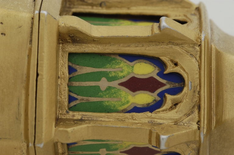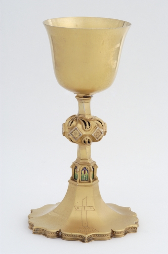 Pied et tige du 15e siècle ; coupe 17e siècle ; émaux refaits au 19e siècle.