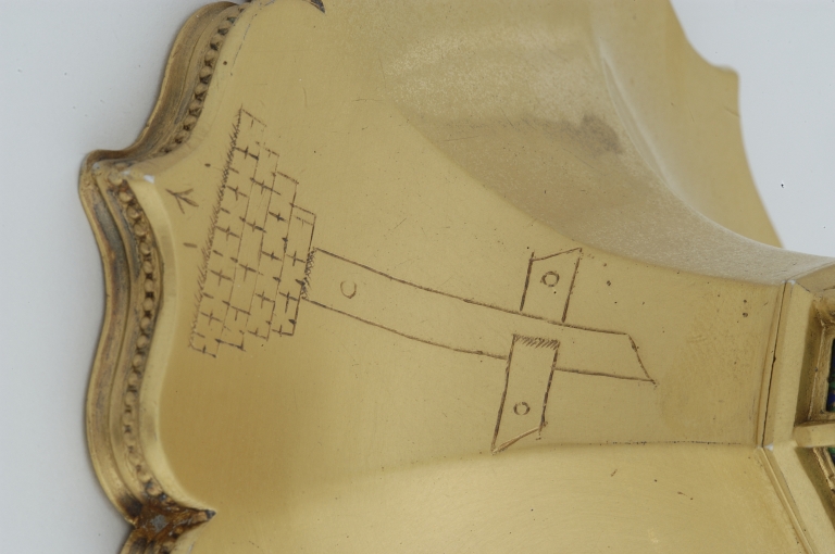 Poinçons (sur le bord de la coupe) : initiales R et D séparées par une hermine, un point sous chaque lettre, une fleur de lys au dessus : maître Richard Drouais ; communauté de Rennes, vers 1630 : hermine passante, lettre R au dessus, lettre A entre les pattes.