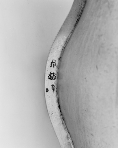 Poinçons (sous les burettes) : initiales A et R séparées par une hermine, une fleur de lys encadrée de deux points et couronnée au dessus, maître Antoine Rahier ; communauté de Rennes, 1769, lettre P couronnée ; charge de Rennes, neuf couronné une hermine dans l´oeil ; décharge de Rennes, une tête de dromadaire.