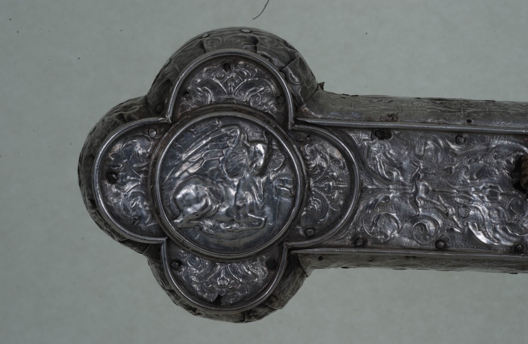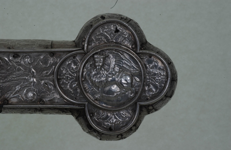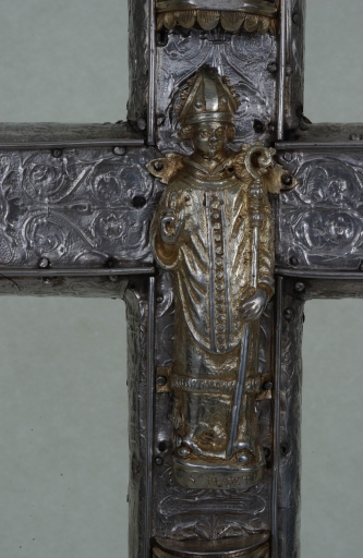 Croix à décor estampé de rinceaux et candélabres, terminée par des quadrilobes ornés des médaillons des évangélistes sur la face antérieure et des docteurs de l'Eglise sur la face postérieure.