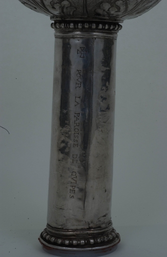 Figurine de saint Martin au revers de la croix ; bras de la croix ornés d'un décor estampé de rinceaux et de candélabres ; tête d'angelots sur le noeud. Inscription (gravée sur la douille) : + POUR LA PAROISSE DE GUIPES.1641.