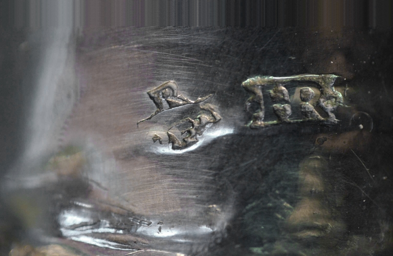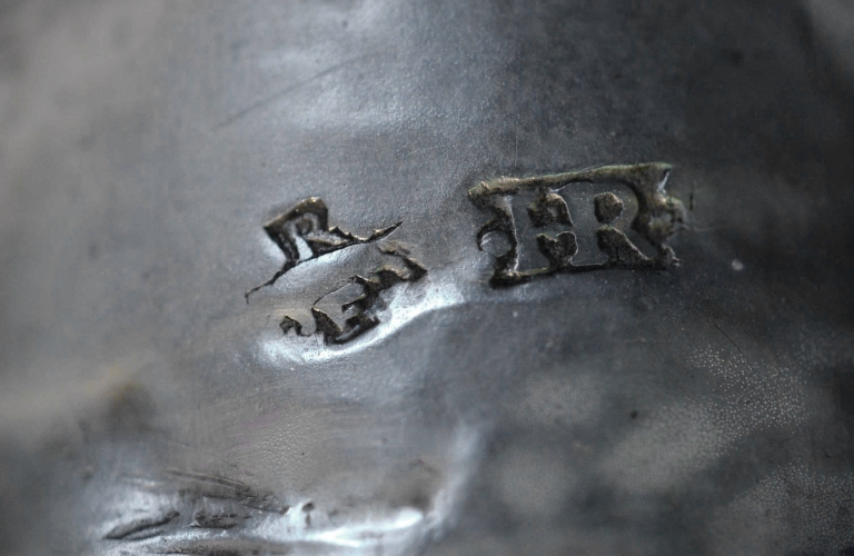 Poinçon de maître : initiales H et R accolées, encadrées de deux points, dans un cartouche rectangulaire découpé, Hierosme le Restif, orfèvre à Rennes. Poinçon de communauté, Rennes : hermine passante surmontée de l'initiale R, lettre F entre les pattes. Inscription : + POUR LA PAROISSE DE GUIPES.1641.
