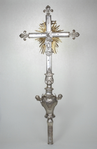 Cette belle croix de procession fait partie d´un ensemble de plusieurs pièces d´orfèvrerie offert entre 1777 et 1788 à la paroisse de Moutiers par son recteur bienfaiteur, Julien Verron. Elle porte, cachés par la figurine du Christ, en argent massif et fondue, les poinçons de Gilonne Paysan veuve de Jean Loison et la décharge de Rennes avec le millésime 86. La douille légèrement renflée à son sommet, le noeud en forme de vase rocaille accosté de têtes d´angelots, la gloire rayonnante qui remplace à la croisée l´iconographie traditionnelle du soleil, enfin les grandes fleurs de lys fleuronnées appartiennent au répertoire à la mode au cours du dernier quart du XVIIIe siècle. Au revers de la croix, l´image de la Vierge de L´immaculée Conception, debout sur le croissant et désignant son sein de sa main gauche. Comme souvent dans les pièces d´apparat de l´orfèvrerie religieuse jusqu´ à la fin du XVIIIe siècle, le style néoclassique n´est pas employé, non par ignorance, mais par choix du rocaille sans doute jugé plus somptueux. Incontestablement il s´agit là d´une oeuvre de qualité, ce que confirme l´élégance des proportions, la maîtrise de la ciselure, ainsi que l´emploi de rayons à double face, réalisés en argent fondu et non en feuilles matricées.