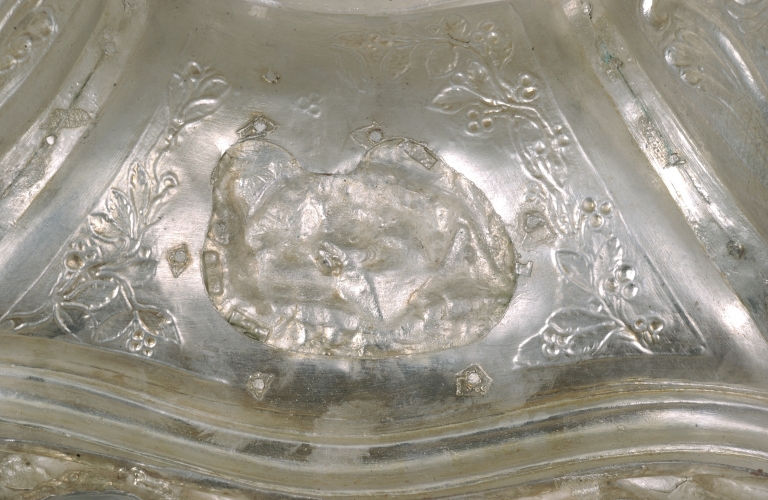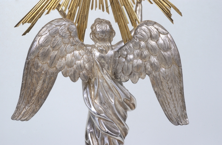 Les rayons, dédoublés de part et d´autre des bras de l´ange, sont maintenus par des broches dont les écrous, moulurés sur la face antérieure sont escamotés dans les rayons. Cet assemblage est une véritable trouvaille qui remédie à cet endroit fragile aux risques de fracture et accentue en même temps par son aspect illusionniste l´idée du rayonnement de la gloire divine. Le raccord de la nuée céleste sous les pieds de l´ange avec le socle fait l´objet d´un même soin qui renforce l´assemblage des deux parties en même temps qu´il maintient l´esthétique baroque du débordement. Enfin la qualité d´exécution du socle, les agrafes, les chutes de feuillages finement ciselés rapportés qui masquent, la soudure des quatre faces, la ciselure du manteau et des ailes de l´ange, ainsi que l´emploi de rayons plein et non simplement estampés contribuent à la grande qualité de l´objet.