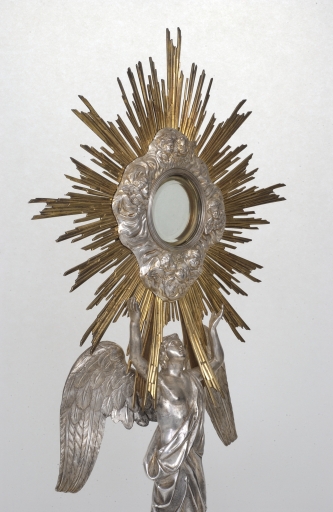 L´emploi ici, en 1786, d´un socle parfaitement rocaille de plan galbé, à pieds détachés et base chantournée, ne doit pas étonner et passer pour attardé : il est surtout synonyme de richesse. L´ange longiligne habillé à l´antique d´un drapé fluide, sa tête et sa chevelure traitées au naturel portent la marque d´un style nouveau, fortement inspiré par les oeuvres d´Edme Bouchardon qui donne au cours de la deuxième moitié du XVIIIe siècle pour la grande église de saint Sulpice de Paris, un ensemble de statues célèbres dès leur installation. La nuée qui entoure la lunule reprend le motif des têtes de chérubins décliné à l´envi sur les ostensoirs du XVIIIe siècle.