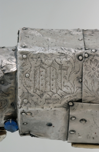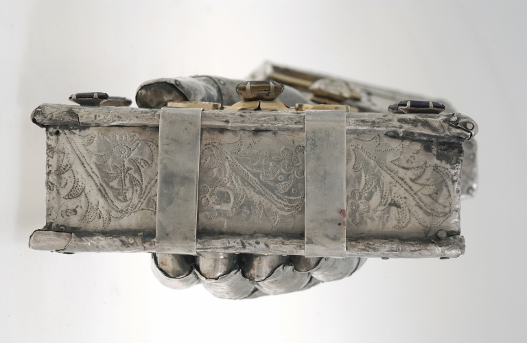 La rigidité de la manche rappelle les oeuvres du XIVe siècle mais le traitement décoratif des rinceaux fleuris ainsi que la découpe en targe de l´écu armorié situent sans conteste l´objet dans la deuxième moitié du XVe siècle. La représentation du livre reproduit fidèlement un modèle de fermoir à deux courroies de cuir venant fermer celui-ci sur le milieu du plat extérieur par deux boutons plat orfévrés, modèle en usage entre le XIVe et la deuxième moitié du XVe siècle, plusieurs fois représenté sur les enluminures contemporaines. Seul le décor de ces deux fermoirs est gravé, tout le reste du décor pointillé, aussi bien sur le plat du livre que sur les côtés du bras, est exécuté à l´aide d´un ciselet. L'arrêt brutal du décor ciselé aux angles du plat du livre, indique qu'à ll'image de la pierre centrale, les quatre pierres actuellement posées sur un fond uni devaient très probablement se détacher sur un quatrefeuille d'argent doré.