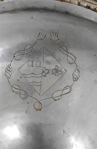 Les armes d´alliance gravées dans un écu losangique entouré d´une cordelière sont celles d´une veuve donatrice de l´objet. Le nom de Traourin livré par l´inscription pourrait être une déformation de celui de Troërin, famille ancienne du Léon, dont le manoir se trouve situé près de la chapelle de Notre-Dame-de-Lambader à Plouvorn, et dont les armes sont « d´azur à la fasce ondée d´argent accompagnée de six besants ». Le nom de terre de Guerguesten pouvant être une transcription de Kerguistin ou Kergestin (le lieu des châtaigniers), pour lequel existent plusieurs manoirs de ce nom en Léon et Cornouaille. Au demeurant, la représentation des armoiries est assez fantaisiste : la partie dextre de l´écu représentant deux fasces ondées au lieu d´une seule et deux petits écussons au lieu des six besants donnés par les armoriaux.