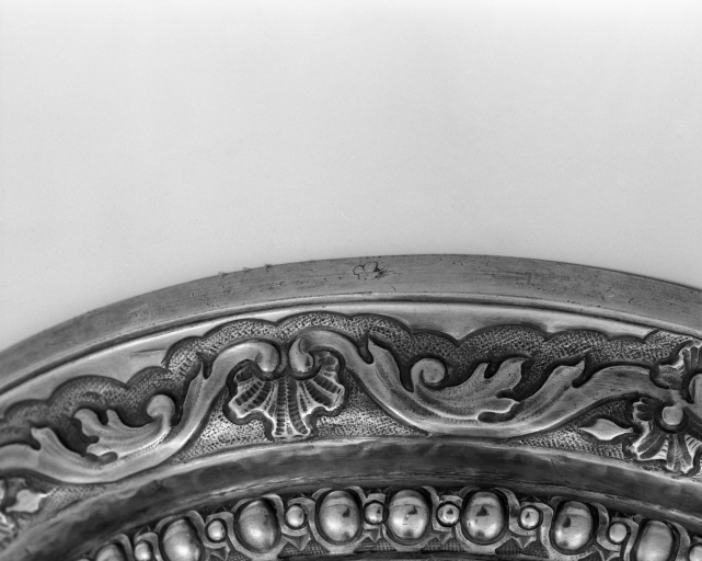 Poinçons (sous le pied et sous le fond du bassin) : initiales J et L accompagnées de 2 grains de remède, hermine, fleur de lys, couronne et rose, maître Jean Loison ; communauté de Rennes, 1748 : D couronné avec hermine à l'intérieur ; charge de Rennes : 9 formé d'un branchage portant feuilles et fruits ; décharge de Rennes 1748 -1749 : un papillon à 4 ailes et 2 antennes.