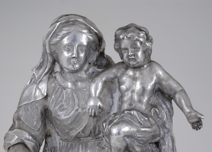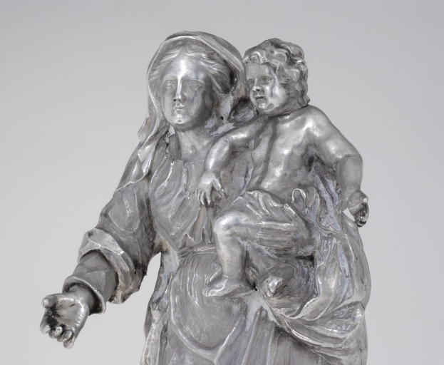 Légèrement hanchée et de trois-quart, la Vierge porte sur son bras gauche l'Enfant Jésus. Son bras droit tendu en avant et sa main entrouverte devaient tenir un chapelet : une confrérie du Rosaire ainsi qu´un tableau du XVIIIe siècle du même nom existent toujours d´ailleurs dans l´église. Elle n'est pas couronnée mais porte un voile, iconographie en rapport avec la relique contenue dans le socle de la statue : un fragment du voile de la Vierge. Une subtile déclinaison des aspects de surface entre le métal poli, presque étincelant du voile et du manteau de la Vierge, du revers des manches de la tunique, le ciselé au mat des vêtements et des chevelures et le rendu satiné des chairs que parcours un réseau de fines rayures à peine perceptibles à l'oeil nu, traduisent le métier d'un maître qui possède pleinement le savoir-faire de sa corporation.