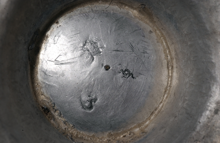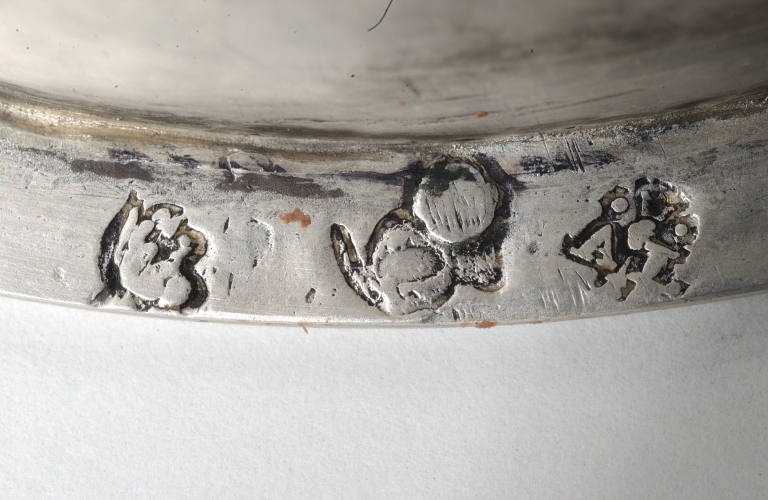 Poinçons (sous la bordure du plateau et sous les burettes, sur leurs bâtes) : initiales A et L séparées par une fleur de lys, hermine en dessous, deux grains couronnés au dessus, maître ambroise Laneau ; communauté de Rennes, 1784 : singe et chiffres 84 ; charge de Rennes : 9 fleuronné ; décharge de Rennes : un pot à eau .
