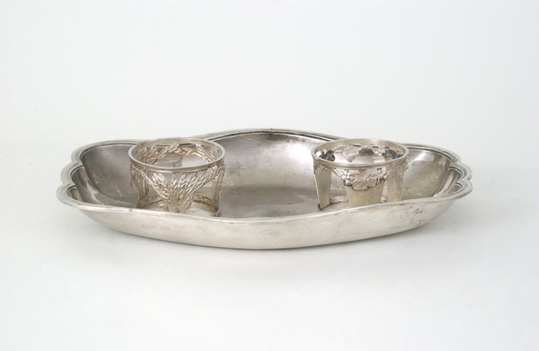 Le bassin, de forme contournée, bordé d´un filet reprend les formes traditionnelles de la platerie apparues vers le milieu du XVIIIe siècle. Pour maintenir les burettes et en même temps les individualiser, l´orfèvre a utilisé des galeries ajourées semblables à celles employée pour les huiliers vinaigriers. Si l´iconographie de la vigne, présente sur la galerie de droite, fortement restaurée au XIXe siècle, paraît s´imposer pour recevoir la burette à vin, celle du blé en revanche, employée pour la burette à eau à de quoi surprendre. En fait, il est probable que, faute d´avoir un décor approprié, l´orfèvre ait tout simplement eu recours ici aux estampages habituellement appliqués sur les fausses coupes ou les pieds de calice de la même époque.