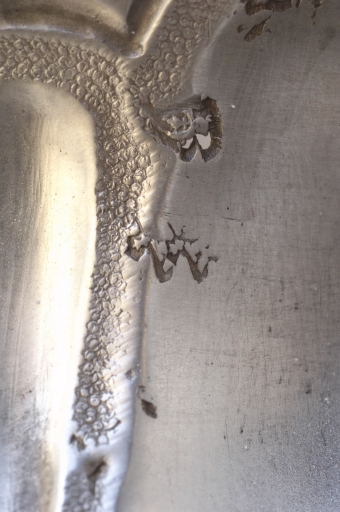 Inscription dans la partie inférieure : DONNE A L'EGLISE DE MOUTIERS PAR Mire JULIEN VERRON Rr DE MOUTIERS 1774. Poinçons (dans l'angle formé par les anses de la lampes) ; initiales F et R séparées par une hermine, fleur de lys encadrée de deux points et couronne au-dessus (partiellement lisible) : maitre François-Gaspard-Jean Roysard ; charge de Rennes : neuf couronné ; décharge de Rennes (?).