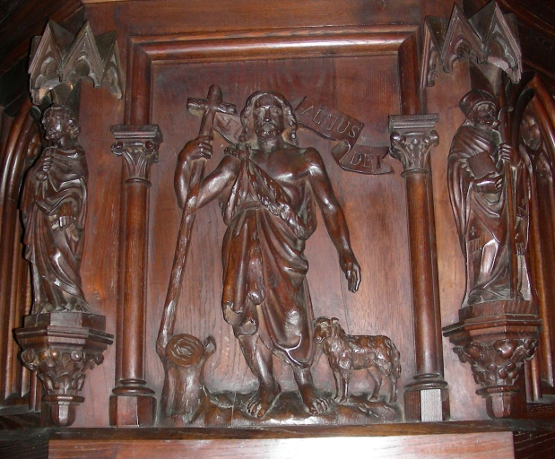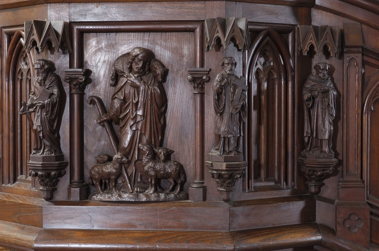 Cuve à bas reliefs représentant le Bon Pasteur et saint Jean-Baptiste, ornée de statuettes de saint Paul, saint Pierre, saint Evêque et de saint Dominique. Pied de la cuve reprend les motifs végétaux des gradins d'autel. L'abas-voix est orné de pinacles et d'arcs brisés.