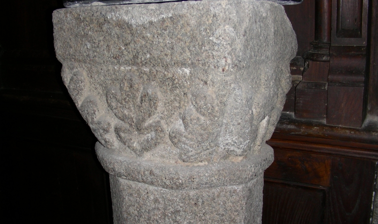 Colonne de section polygonale avec chapiteau sculpté de feuilles.