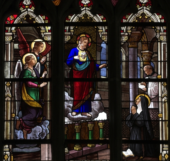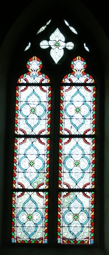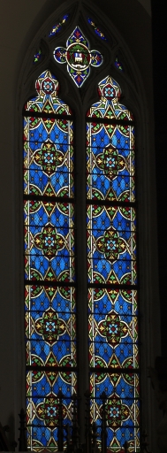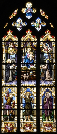 Baie 4 : Blasons des familles Gouyon et Querhoënt ; 2e registre : saint Jean-Baptiste, saint Michel, saint Joachim ; 3e registre : Donation du Rosaire ; 4e registre : Angelot et Vierge-Assomption. Baie 3 : 1er registre : Armes de Pie IX, de Gustave de Gouyon et son beau-fère François de France et armes de Gustave de Gouyon et de sa femme ; 2e registre : SAINT ROCH ; SAINT JUDE ; 3e registre : Apparition du Sacré-Coeur à sainte Marguerite-Marie Alacoque ; 4e registre : angelot, Trinité.