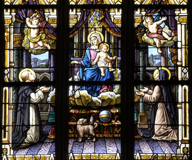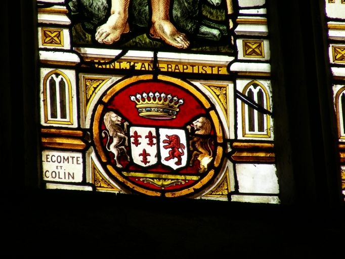 Baie 1 : RENNES/1880 ; armes du cardinal Charles Philippe PLACE ; Baie 2 : LECOMTE/&/COLIN ; Armes de Léon XIII ; Baie 4 : LECOMTE/ET/COLIN ; saint Michel ; saint Jean-Baptiste ; saint Joachim. Baie 3 : SUR MON HONNEUR ; Baie 5 : RENNES [...]. DON/DE MLLES. SOEURS/CORVAISIER. LECOMTE/ET/COLIN ; Baie 6 : RENNES/1889 ; DON/DE MONSIEUR. A.CORVAISIER ; Baie 9 : GUILLAUME LE BRET ET MARIE DUFIL SON EPSE ; Baie 10 : CHAPERON & SES ENFANTS JULIE LEBRET VEUVE ; Baie 12 RENNES 1879 ; Baie 11 : DON DE. MR ET MME DE FRANCE.