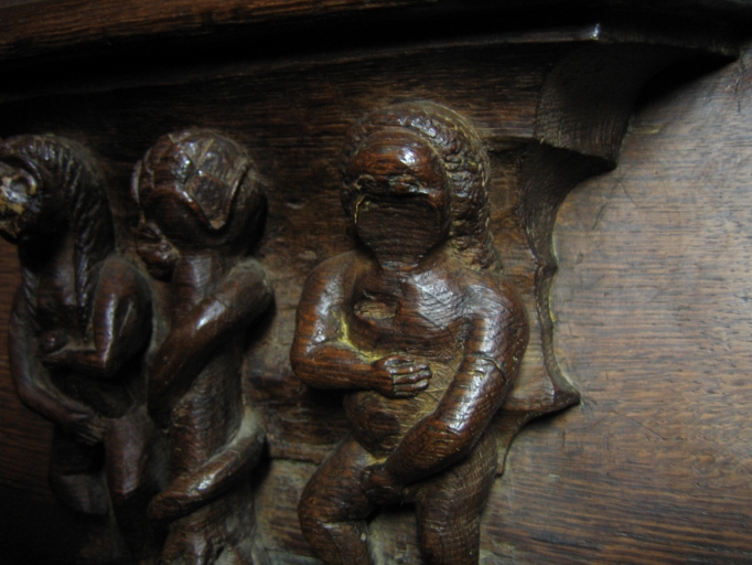 Sur la miséricorde : Adam et Eve sont représentés nus autour de l'arbre de la Connaissance. Un serpent s'enroule autour de cet arbre tandis qu'Adam et Eve tentent de cacher leur nudité. Eve, reconnaissable à ses longs cheveux tient encore la pomme dans sa main gauche. Sur le panneau du haut-dossier : un personnage masculin nu joue d'une trompette végétalisée au centre du panneau.