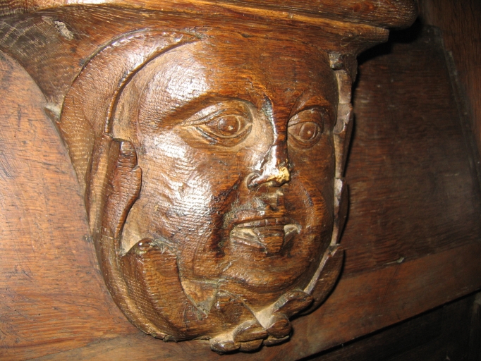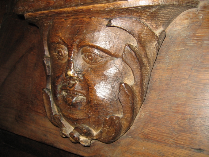 Sur la miséricorde : tête d´homme, vu de face et tirant la langue entre ses dents bien visibles. Son visage est encadré par des formes végétales et sous son menton, on distingue une petite fleur à l´envers. Ses pupilles sont creusées, son nez est fin. Les bajoues et le double menton suggère qu´il s´agit d´une personne plutôt âgée.