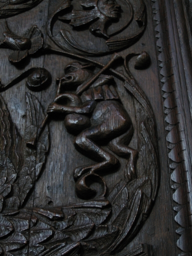 Cette miséricorde met en scène deux homme, vêtus tous deux de longue tunique ceinturée, ce qui pourrait sous-entendre qu´il s´agit de chanoines. L´un des personnages, placé sur la gauche, soutient son camarade, complètement renversé sur le dos. Celui-ci tient à deux mains un tonnelet qu´il tête goulûment. Il porte une coiffure particulière, composée de rubans et nouée sous son menton. Sur le panneau du haut-dossier, on remarque un porc jouant de la cornemuse, instrument tabou dont la panse est faite en porc.