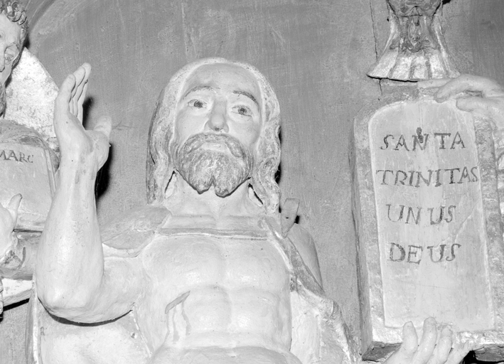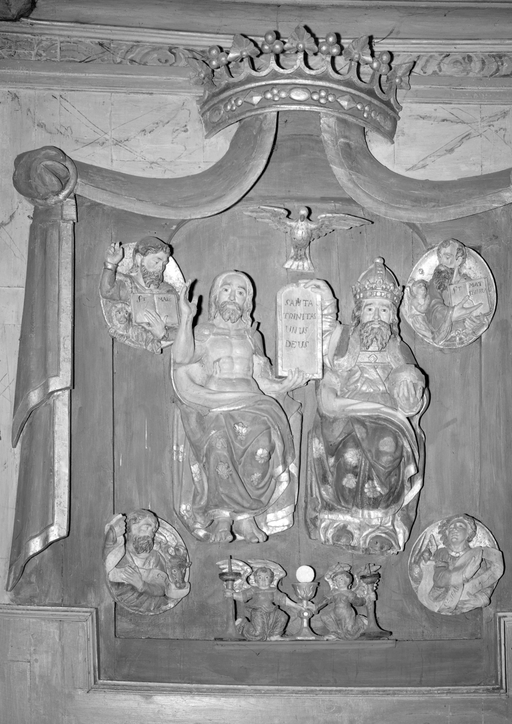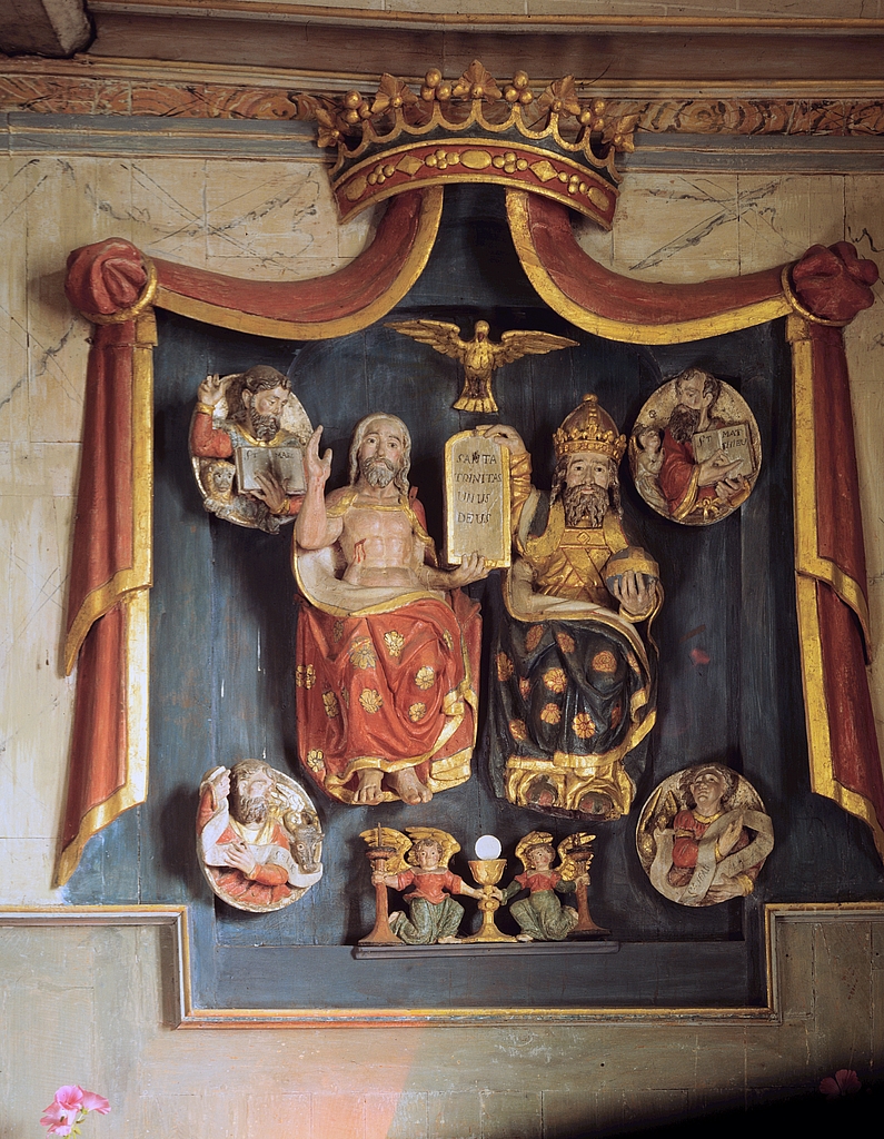Inscription au centre : SANTA TRINITAS UNUS DEUS ; noms des évangélistes peints sur phylactères.