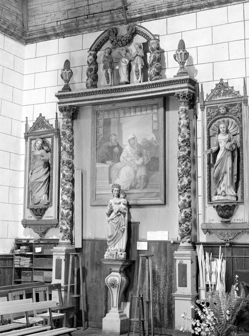 Retable encadré de 2 colonnes torses surmontées d'un entablement et d'une niche de couronnement à fronton semi-circulaire et accosté de 2 niches latérales indépendantes.