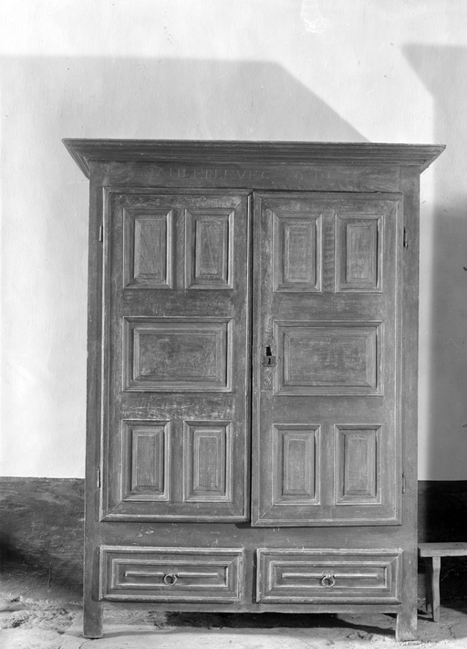 Armoire datée 1670 faite par ou pour Ian Le Blevec comme le mentionne l'inscription située sous la corniche.