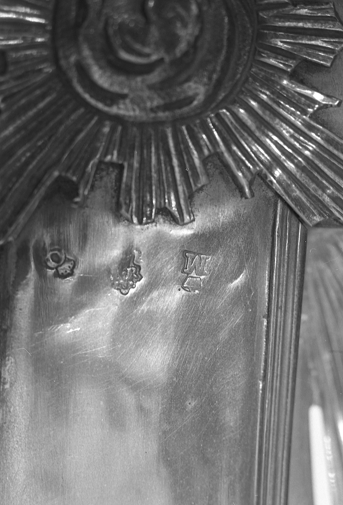 Poinçon de charge : chiffre 9 fleuronné et couronne (rennes 1780 1781) ; Lettre-Date : lettre M couronnée (Vannes 1780 1781) ; Poinçon de maître : lettres B et R séparées par un point (poinçon incomplet ?).