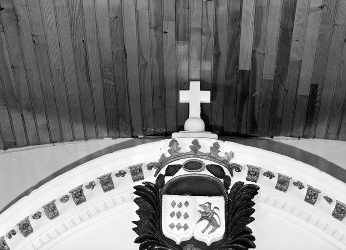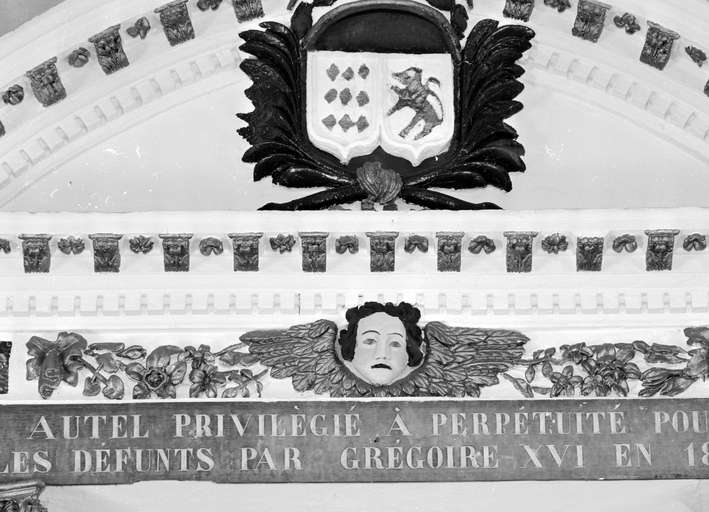 Inscription au dessus de la contretable : AUTEL PRIVILEGIE A PERPETUITE POUR LES DEFUNTS PAR GREGOIRE XVI EN 1844 ; blason en alliance des Le Sénéchal et des Gouyon : d'argent à neuf mâcles d'or en alliance avec : d'argent à lion d'or.