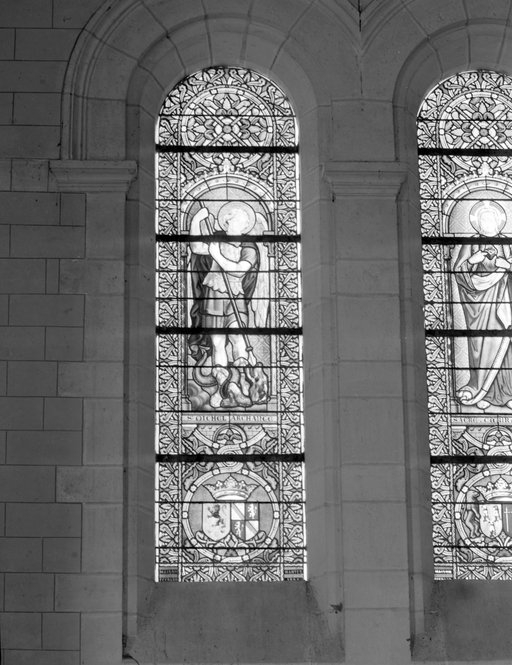 Appellationsverrière à personnages, verrière héraldique, grisaille décorative