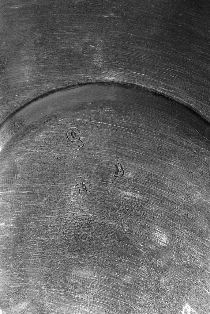 Poinçon de charge : chiffre 9 fleuronné et couronne (1781 1789) ; poinçon de décharge : aiguière (rennes 1781 1789) ; Lettre-Date : lettre O couronnée, une Hermine dans l'oeil de la lettre (1784) ; Poinçon de maître : lettres J et P séparées par un point, lettre M et T séparées par un point, couronne au dessus.