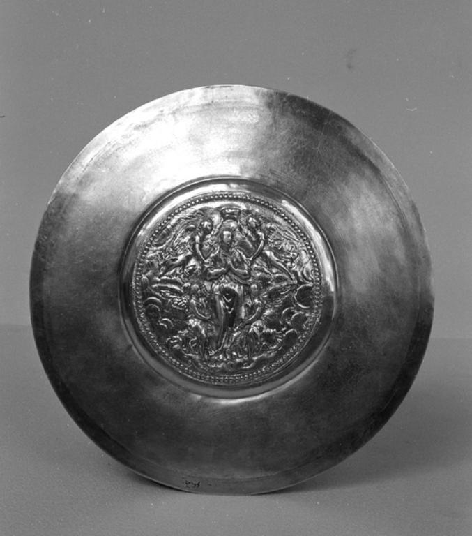 Fausse coupe. Pour le décor de la patène : technique de fonte ; assemblages par enfilage, vis et soudures.