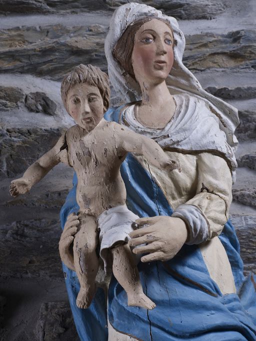 Nombreuses écailles dans la polychromie ; le bras droit de l'Enfant est désolidarisé, ainsi que le bras gauche de la Vierge, au niveau du coude ; vermoulure.