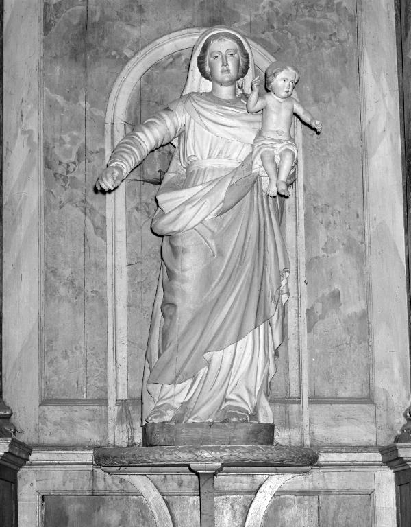 Œuvre d'exécution artisanale ; la position des bras droit de la Vierge et gauche de l'Enfant ainsi que le geste de leur main permet de penser que la statue représente une Donation du Rosaire.