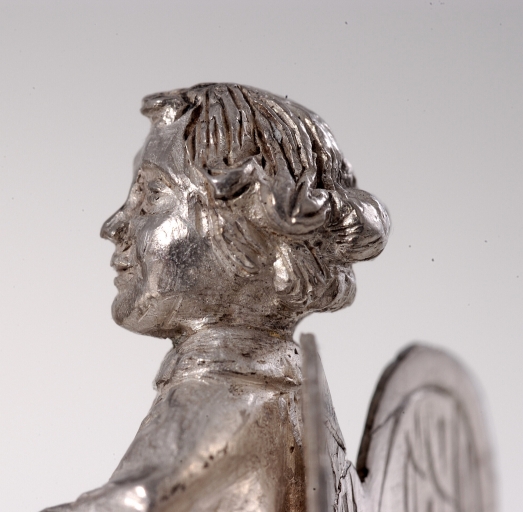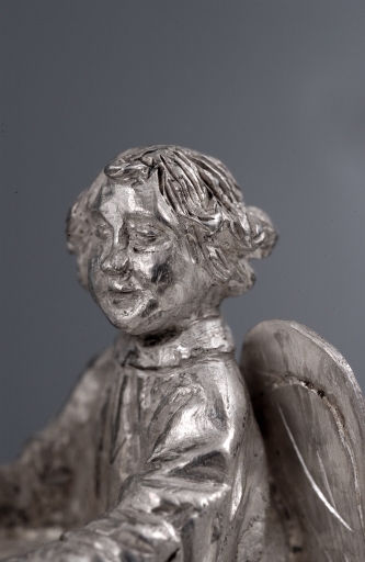 Le thème des anges présentant des reliques, déjà connu à l´époque romane, se répand au XIIIe siècle à l´imitation du reliquaire de la Sainte Chapelle de Paris destiné à la couronne d´épines du Christ. Ce modèle, diffusé par le biais des milieux princiers, est représenté en Bretagne occidentale par celui de Plougourvest, identifié par son poinçon comme étant une production de Paris de la fin du XIVe siècle. Sur le reliquaire de Saint-Laurent-sur-Oust, les anges perchés sur des colonnes rappellent ceux des courtines d´autel, disposition propre au Moyen-Age, représentée entre autres sur le tableau de la Messe de Saint Gilles, conservé à la National Gallery de Londres. La reprise en ciselure des visages des anges, celle de leur chevelure, sillonnée de traits au burin, leur confère, malgré la petitesse de l´objet, une réelle expressivité. La taille exagérée des mains, fondues séparément et rapportées, souligne intentionnellement le geste de la présentation. Les ailes, simplement découpées dans une petite feuille d´argent, sont ornées d´un léger décor gravé. Les bases à pans verticaux des colonnes, la forme hexagonale du pied central, le nœud à pans bombés recreusés par un sillon médian sont autant d´éléments qui situent ce petit reliquaire vers la fin du XIVe siècle ou le début du XVe siècle. Le reliquaire pédiculé de Chasné-sur-Islet (Ille-et-Vilaine), volé dans les dernières années, les armoiries gravées sur le pied confirment cette datation et livrent l´identité du commanditaire. Ces armes correspondent à celles de la famille de Champaigné ou Champagné en Gévezé près de Rennes, qui sont d´hermines au chef de gueules. Or les Lettres et mandements du duc Jean V mentionnent en 1406 un certain Thomas de Champaigné, receveur pour le compte du duc des revenus de l´importante forêt de Touffou au sud-est de Nantes. Ce personnage est visiblement proche du prince au point qu´il avance « 16 ecus pour un haubergeon d´acier (petite cotte de maille) pour monseigneur ». Par ailleurs, époux d´Anne de Malestroit, héritière d´une branche de cette illustre maison, celle de Beaumont à Saint-Laurent-sur-Oust, il est sans doute le commanditaire du présent reliquaire. Tous ces indices concordent donc pour dater de la fin du XIVe siècle ou du début du XVe siècle cet objet dont la petite taille et le raffinement d´exécution sont directement issus de l´art de cour de l´époque. Toutefois, l´absence de tout poinçon, celle d´émaux et de pierreries, et l´identité du commanditaire permettent d´y voir l´œuvre d´un atelier de haute Bretagne. Entre Rennes et Nantes, il est difficile de trancher.