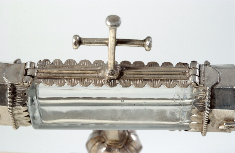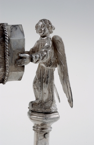 Reliquaire pédiculé. Le cylindre horizontal surmonté d'une petite croix est soutenu par un pied hexagonal et une tige à six pans avec nœud sphérique à côtes. Deux appendices latéraux y rattachent des colonnettes à bases aussi hexagonales, qui portent des anges tenant les extrémités du cylindre reliquaire. Un écu est gravé sur la face antérieure du pied.