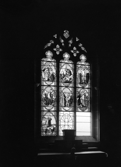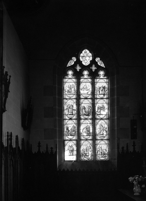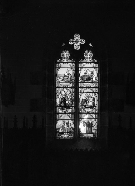 Description : toutes les scènes s'inscrivent dans des médaillons ; en bordure des lancettes court une ligne avec un motif à fleurette.
