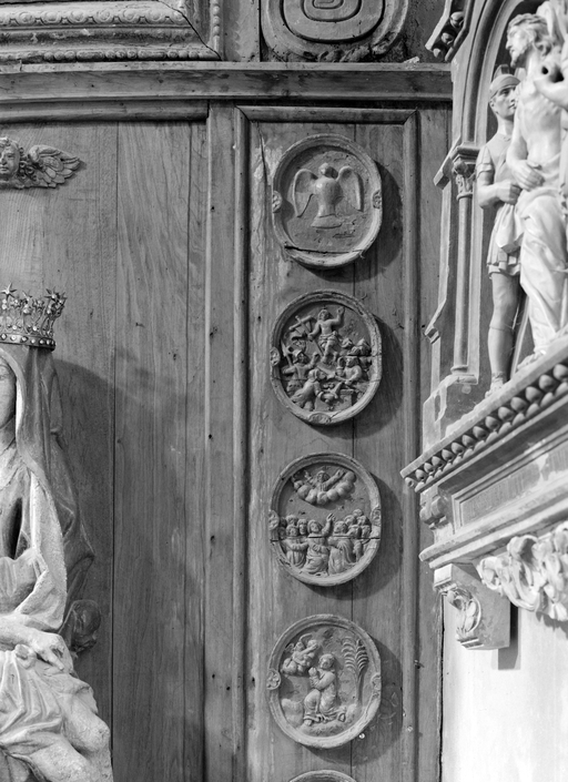 Description : l'Assomption est représentée sur l'édicule d'amortissement, les scènes de la vie du Christ et de la Vierge sur deux fois sept médaillons superposés.