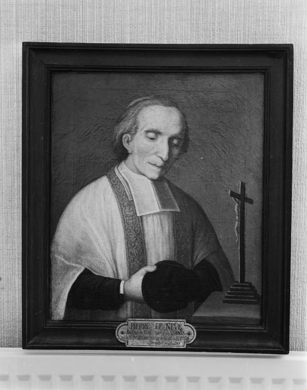 Inscription peinte en noir au revers : PIERRE LE NEVE RECTEUR DE SENE EVECHE DE VANNES NE LE 24 9BRE 1678 MORT EN ODEUR DE SAINTETE LE 28 9BRE 1749 LHERMITAIS PINXIT EN 1749.