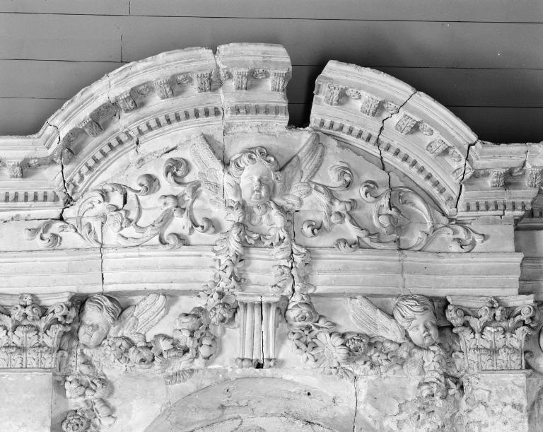 Niche en hémicycle accostée de pilastres épaulés d'ailerons ; entablement de plan et d'élévation chantournés.