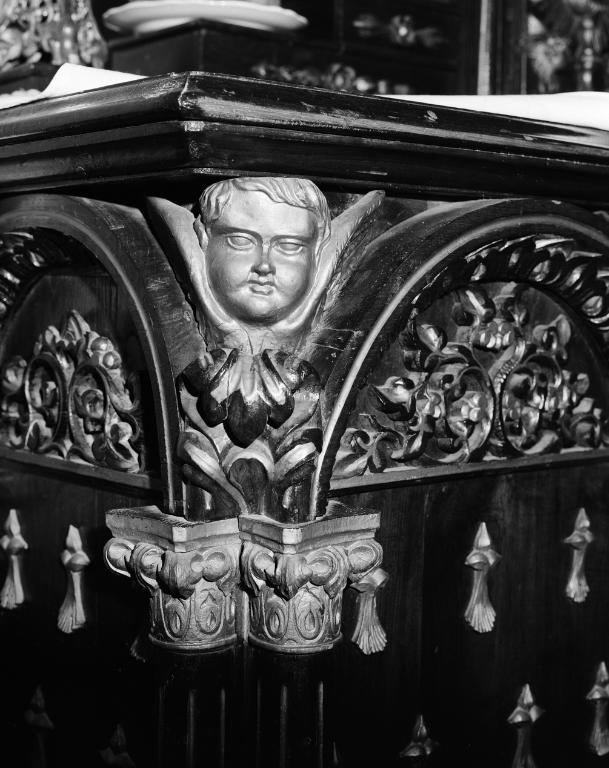 Têtes d'angelots aux angles de l'autel. Porte du tabernacle ornée d'un ciboire dans une gloire entouré d'angelots.