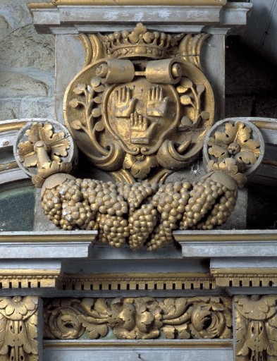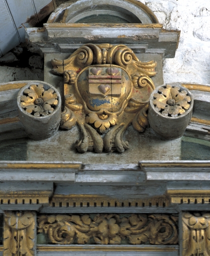 Eléments du retable (majeur ?) provenant de l'église paroissiale, datant de la 2e moitié du 17e siècle offerts par deux familles dont la famille Guengat, dans laquelle se fond la famille de Rimaison avant 1636. Les armes de la seconde famille n'ont pas été identifiées.