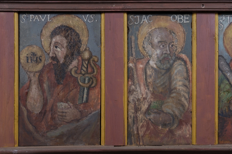 Inscriptions sous les bas-reliefs côté choeur (de gauche à droite) : STE JACOBE, STE ANDRE, STE JOANES, STE THADE, STE JACOBE, SANCTE PETRE, SALVATOR MONDE, SANCTE PAVLE, STE MATIAS, STE BARTALOME, STE THOMAS, STE SIMONE, STE JACOBE. Inscriptions sous les bas-reliefs côté nef (de gauche à droite) : ST JACOBE, ST SIMONE, STE THOMAS, STE IOANES, S PHILIPPE, S PETRUS, S SAVVEUR, S PAVLUS, S JACOBE, Ste THADE, S MATIAS, Ste ANDRE, Ste BARTHOLOME.