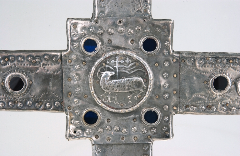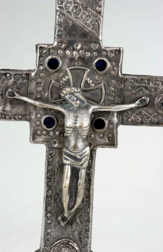 Cette croix est à rapprocher de deux autres semblables de forme et de décor, conservées, l´une à Campel, et l´autre à Montreuil-des-Landes, en Ille-et-Vilaine. Toutes trois présentent la même mise en oeuvre mixte de laiton argenté pour les bras, le noeud et la hampe, et d´argent uniquement pour les médaillons appliqués. Cette association si particulière, bien visible par la différence de couleur des parties en relief exposées à l´usure a dérouté les auteurs qui y voient tantôt des oeuvres en argent avec des traces de dorures, tantôt des oeuvres en étain. Si le décor d´une croix à l´autre présente quelques petites variantes, son exécution, essentiellement à base de molettes poinçonnées en relief et de lignes de pointillés poinçonnées en creux, est tout à fait caractéristique et se retrouve sur chacune d´elles. Des médaillons des évangélistes également identiques et surtout le médaillon de l´agneau divin, au revers, avec l´hermine et la fleur de lis, signent la production d´un même fabricant. Ce motif de l'agneau divin nimbé, la tête tournée vers l'étendard du Christ, emprunté aux monnaies royales du XIIIe siècle, dites à l´Agnus Dei, se retrouve fréquemment employé à partir du XIVe au revers des croix de procession.