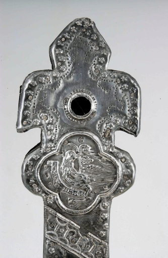 Le cuivre ou le laiton plaqué d´argent ou d´or, connu dès le XIIIe siècle comme substitut des métaux précieux, fut relativement peu employé par les orfèvres bretons. Néanmoins, la mise en oeuvre du décor relève de toute évidence ici du travail d´un orfèvre qui n´a pu y apposer son poinçon puisque l´emploi de métal vulgaire plaqué ne le permet pas jusqu´au XVIIIe.