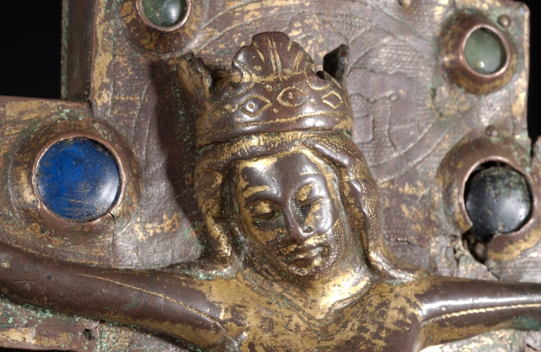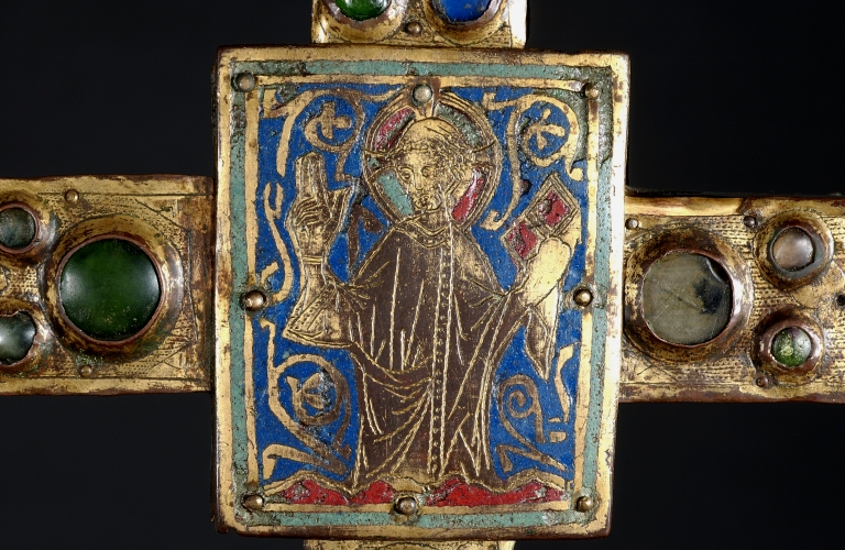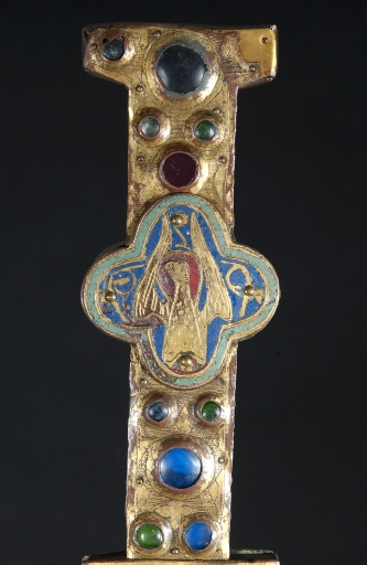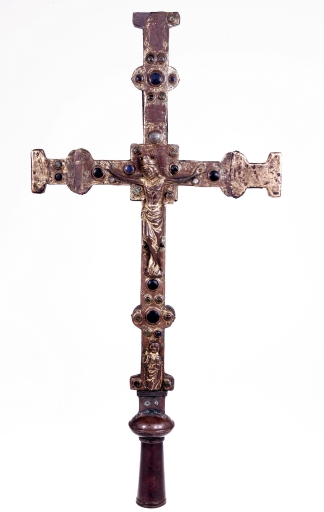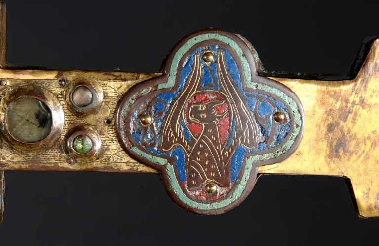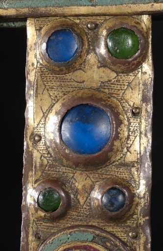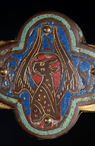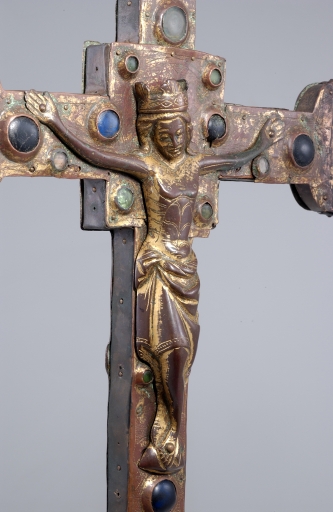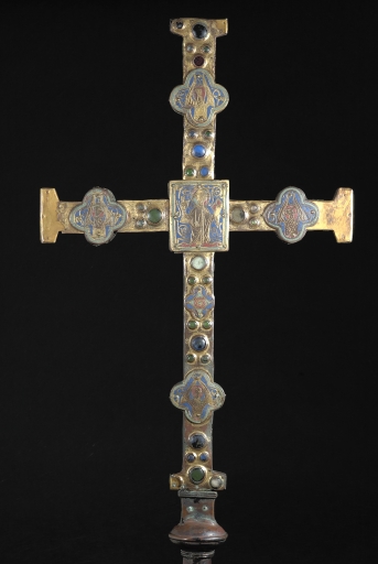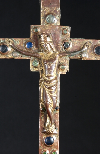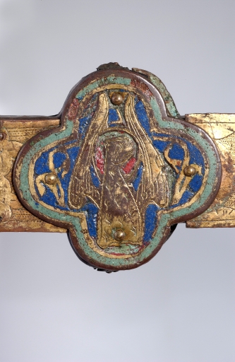 A la différence de la plupart des croix du limousin, la croix elle-même n´est pas ici en cuivre fondu mais en bois recouvert de plaques de cuivre gravées et dorées. Le décor est essentiellement obtenu à l´aide de cabochons de pâte de verre bleus et verts alternés. Ces pierres factices se détachent sur un fond mati gravé au tremblé et semé de petits motifs losangiques ou quadrilobés. La dorure des feuilles de cuivre, aujourd´hui très altérée sur la face antérieure de la croix devait contribuer pour beaucoup à l´effet de richesse de l´objet. Sur la face postérieure, les plaques émaillées selon la technique du champlevé présentent une gamme chromatique réduite : bleu intense de lapis lazuli pour les fonds, turquoise pour les bordures et rouge rubis pour les auréoles, les nuées et les attributs, gamme tout à fait caractéristique des dernières décennies du XIIIe siècle. Le parti de figures réservées en métal et non émaillées se détachant sur un fond de couleur est également typique de cette époque, de même que les rinceaux un peu raides également traités en réserve. La gravure des figures du tetramorphe et du Christ, de grande qualité, associe trois techniques, le trait continu pour les plis et les traits courts, le trait au tremblé pour les contours et le trait au pointillé pour les parties tournantes du dessin. Le Christ en croix est très semblable à celui de la croix d´Argentat, datée de la deuxième moitié du XIIIe siècle ; une reprise en ciselure visible dans les cheveux, la barbe, la couronne et le torse, contribue avec l´ensemble du décor à distinguer cette croix de la production courante de cette époque.