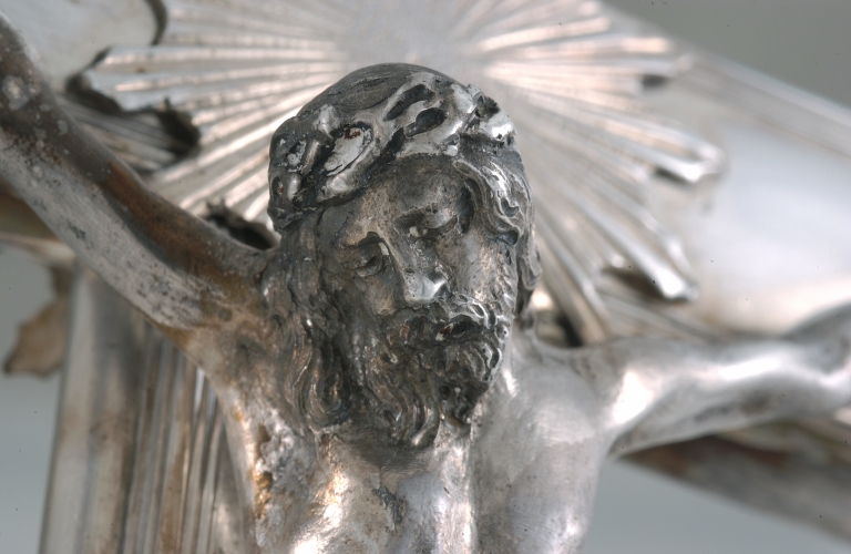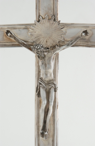 L´inscription gravée au revers du piédestal de cette belle croix d´autel, décrit de façon explicite l´origine de la relique contenue dans le réceptacle de sa face antérieure. Selon une pratique courante depuis le Moyen-Age et qui perdure jusqu´à la fin du XIXe siècle, ce fragment supposé de la Vraie Croix aurait été ramené en 1727 d´un pèlerinage à Rome par un ancien recteur de Questembert. La croix d´autel, faite bien des années après si l´on en croit le poinçon de communauté de Rennes qui porte la lettre date G pour 1756-1762, acquiert par l´incorporation de ces reliques une sacralisation supplémentaire. La croix elle-même, très simple, légèrement bombée et surlignée d´une bordure moulurée, est ponctuée des traditionnelles fleurs de lys, propres aux modèles du XVIIIe siècle. Le Christ, fondu, habilement repris en ciselure, le soleil qui masque le raccord de la croisée, en font une oeuvre de bonne qualité qui pour autant n´en demeure pas moins relativement banale. En fait la principale originalité de l´objet, non visible réside dans son raccord avec le pied, qui se fait à l´aide d´un large pas de vis. Ce montage qui rappelle celui des calices, peu habituel pour les croix d´autel, a peut-être été employé ici pour que la croix puisse aisément se remonter sur une hampe afin de servir également de croix de procession. L´absence d´une hampe et d´un noeud assortis dans le trésor paroissial ne permet pas d´aller plus loin dans l´hypothèse, mais des pièces d´orfèvrerie à double usage comme des pieds de calice pouvant servir également de support d´ostensoir sont connus dans l´orfèvrerie de basse Bretagne à la fin du XVIe siècle. D´autre part, une croix d´autel reliquaire conservée à Carnac, due à l´orfèvre lorientais Thomas Rousse, de hauteur importante et enrichie de rayons à la manière des croix de procession, présente ce même mode de vissage qui permet d´envisager un tel usage mixte. La silhouette à pans concaves du piédestal rectangulaire, et surtout son sommet en niche ont été dessinés afin de mettre en valeur le reliquaire. Les importants pieds rocailles, fondus et repris en ciselure à la manière des bronzes d´ameublement parisiens contemporains, modèle qui n´est guère employé en Bretagne que par les orfèvres de Rennes, sont parfaitement assortis au décor ciselé des pans latéraux. Les bourrelets ciselés d´une frise d´oves et de dards qui rehaussent les lignes, l´emploi de jeux de fonds différenciés, sablé ou en écaille sont caractéristique des beaux ouvrages d´orfèvrerie de l´époque de Louis XV. Ici l´orfèvre rennais Jean-Baptiste Dréo, dont peu d´oeuvres sont conservées, donne la mesure de son talent, égal en l´occurrence à celui d´un Michel-Eloi Le Tailleur ou d´un Jean-Baptiste Buchet.