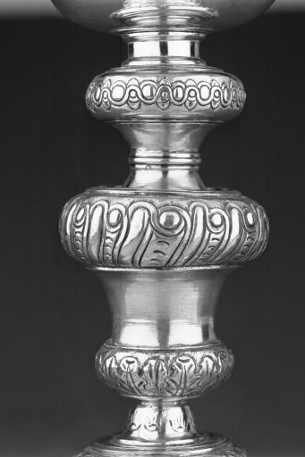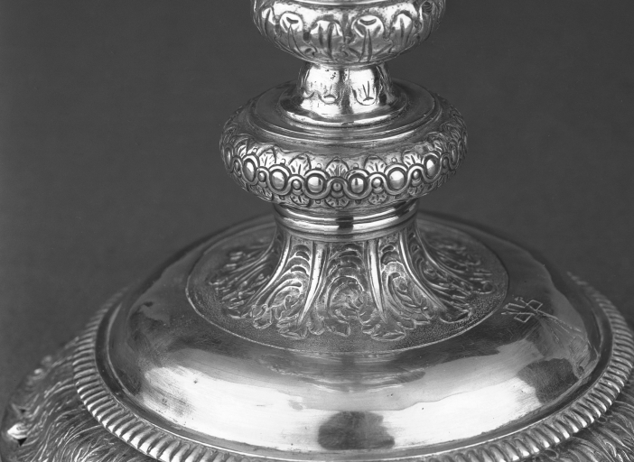 La bordure de feuillages estampés du pied, en large doucine est encore un souvenir des calices du XVIIe siècle alors que la forme de l´objet et le reste du décor, oves entrelacs et godrons tournants appartiennent pleinement au répertoire de la première moitié du XVIIIe siècle. Un certain schématisme dans le traitement de ce décor transforme presque la tige du calice en une alternance d´étranglements unis et de bagues ciselées. D´autre part, la fusion d´entrelacs, de godrons tournants et de rocailles visible sur le commet du vase n´est pas conforme aux modèles ornementaux en vigueur. Ce traitement quelque peu naïf et pour le moins très libre, n´empêche pas un certain souci de qualité. Une technique très particulière d´ombré, obtenue rapidement par l´emploi d´un poinçon perlé, permet ainsi d´accentuer le contour du dessin.. Dans l´état actuel des recherches il est difficile d´identifier le maître orfèvre rennais aux initiales I G. En tout cas, une attribution jusqu´alors avancée à Jean Baptiste Gérard est exclue, compte tenu des dates de réception et d´activité de cet orfèvre qui se situent toutes deux dans le dernier quart du XVIIe siècle.