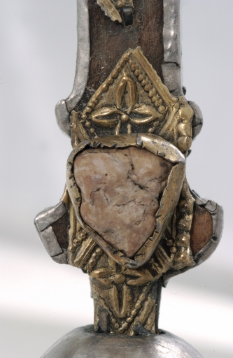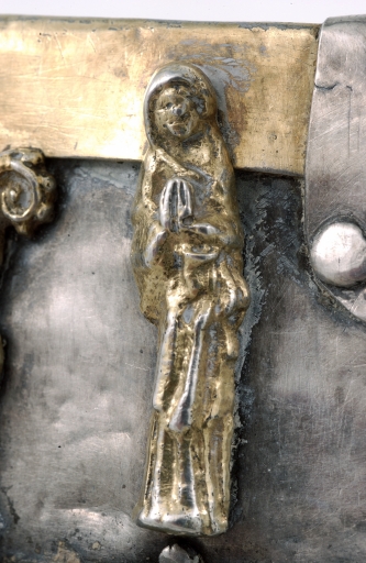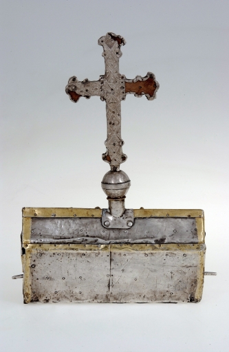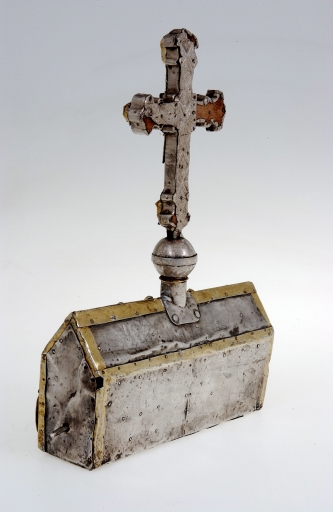 La croix a été remontéee sur le sommet de la châsse à la fin du 19e siècle : la sphère intermédaire date de cette époque ; plusieurs manques dans les feuilles d'argent estampé qui garnissent la croix.
